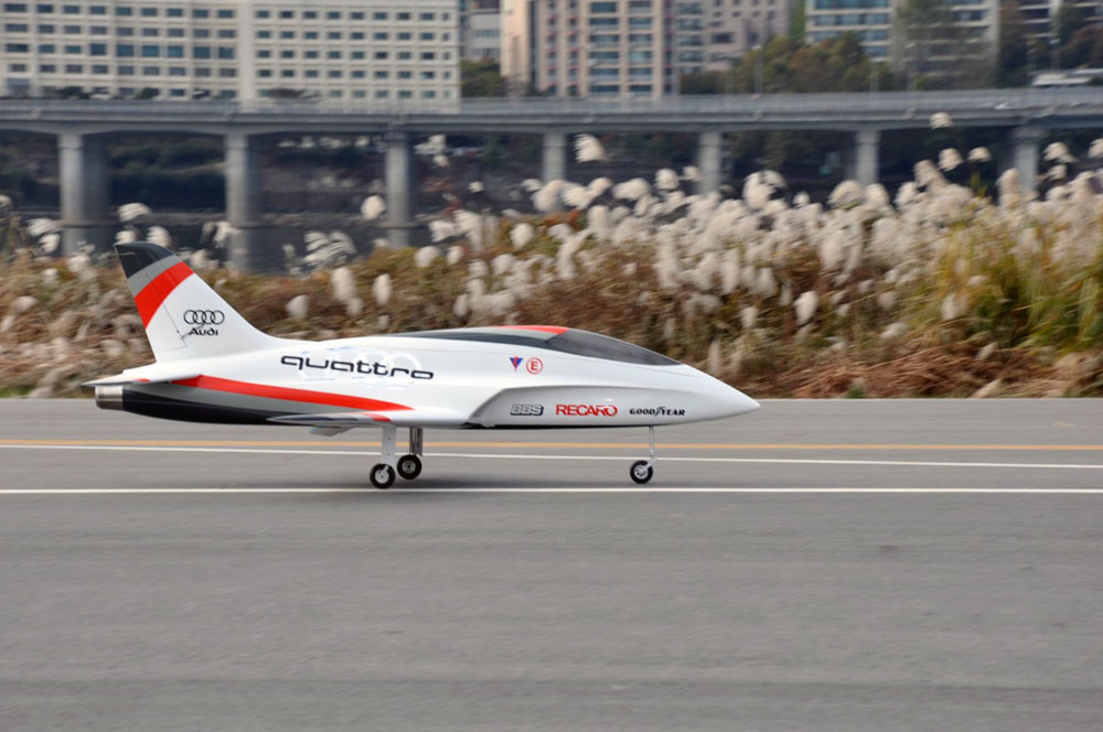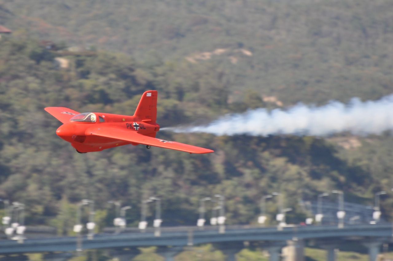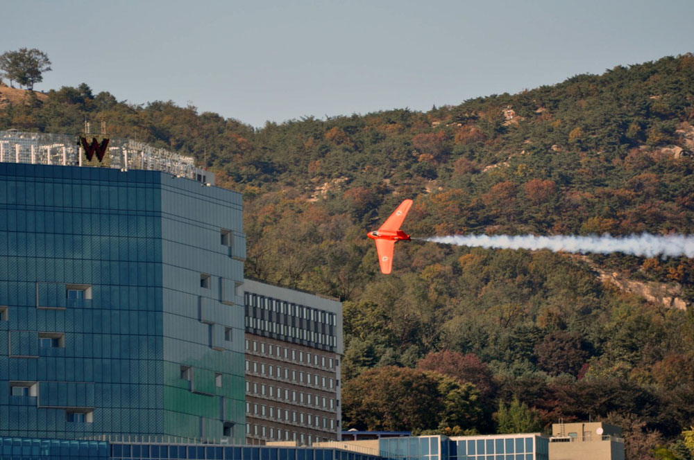 この機体はドイツから来た第2次大戦末期のスケールジェットらしくダリーを使って離陸させすばらしい飛行を見せてくれました。ビルがすぐそばに迫っています。日本なら完全にだめという場所だと思いますが、ソウル市からは許可が出たのです。