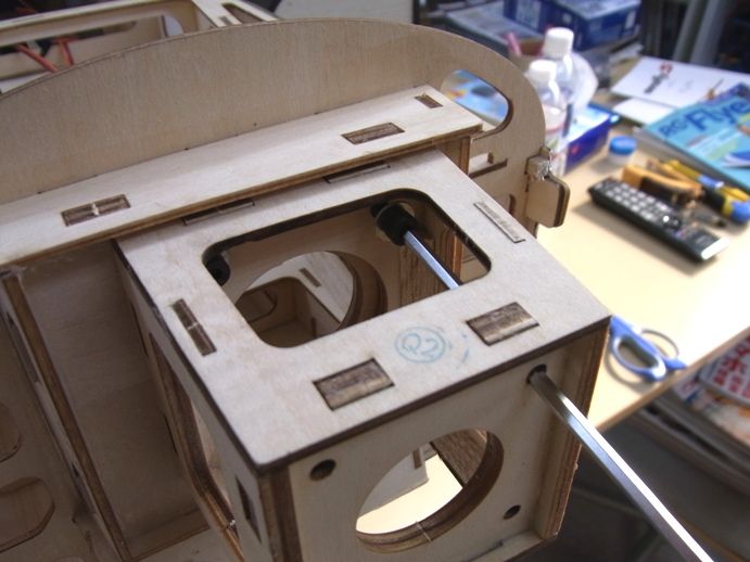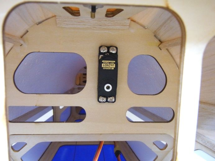 胴体内部には胴枠にサーボの穴が開けられています。この穴は33mmX15mm で、DS3401やフタバBLS317SVなどぴったりなのですが何せ胴体奥なので手を入れてサーボをこの穴に入れるのが結構大変でした。ただその狭さのせいもあるけれども、年をとってきて幾分か手が不自由になってきたせいもあるかもしれません。