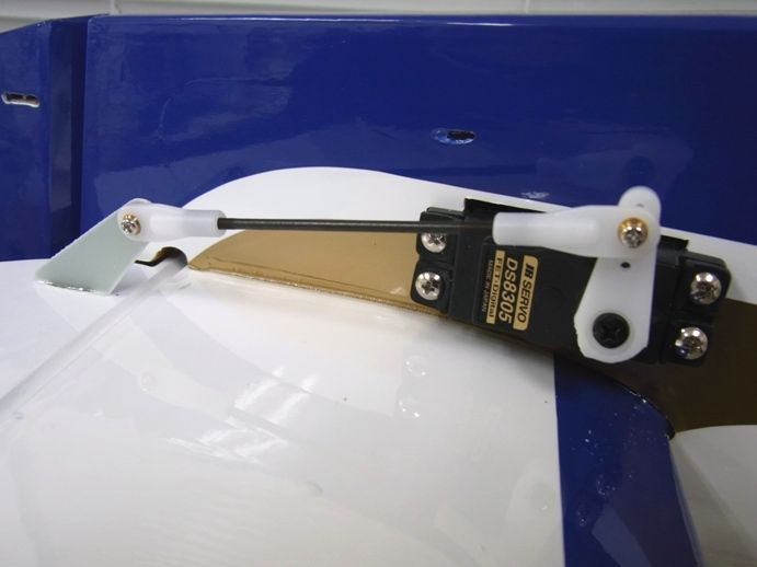 ノーズギアステアリングサーボとリンケージします。ここも実は狭くて作業がしにくい箇所でしたが、何回かののちに何とか無事収まりました。なおこのノーズステアリングサーボはラダーサーボの動きとミキシングしてあります。