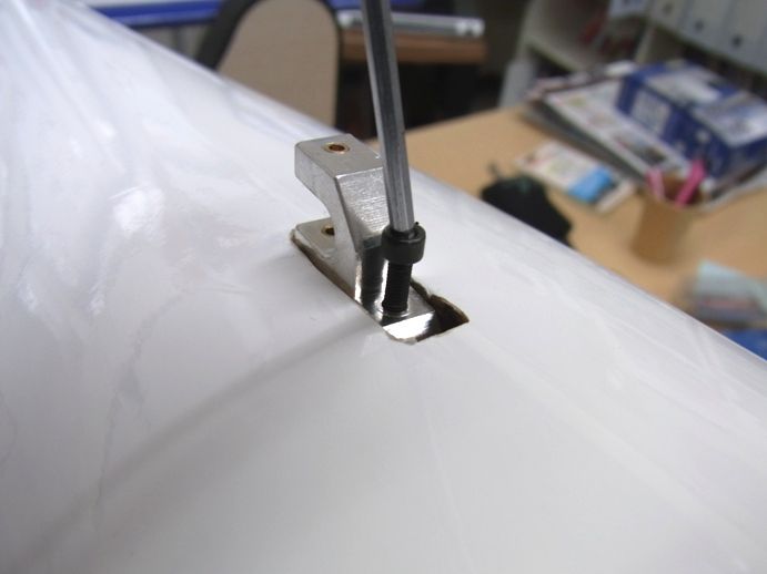 このロッドがいざとなった時にトーラインをリリースする役目を果たします。この写真のようにロッドを下に下げてトーラインを外します。この工作は思ったより時間がかかりました。手がなかなか入らず、意外に時間を食いました。