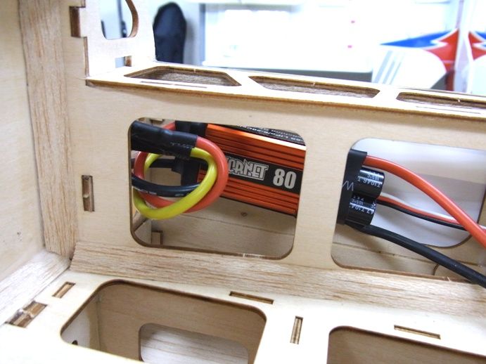 アンプもSkyRCのHornet80という廉価版BECアンプをテストすることにしました。特にスタント機でもないのでトップレンジの性能よりもコストパフォーマンスに優れていればということで今回テストしてみることにしました。プログラマーもありますが、工場出荷状態で特に問題なく起動し、モーターもスムーズに回っています。