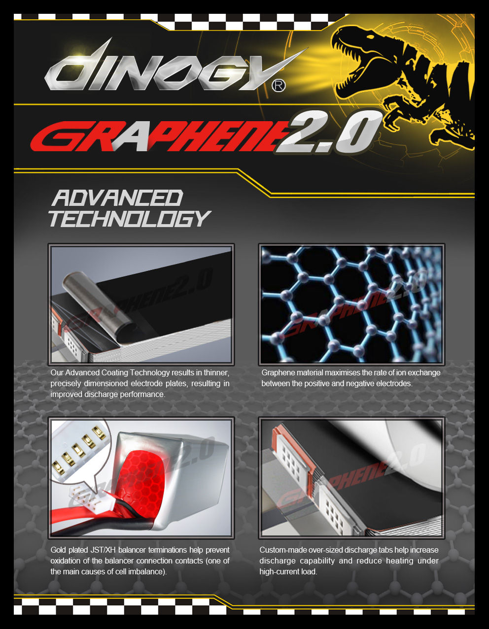強烈な電気エネルギーを一気に貯めこみ、無抵抗に一気に吐き出すことができるこの画期的な材料と生産技術により、DinogyのGraphene2.0シリーズは瞬く間に世界中のFPV過激フライヤーを虜にしました。