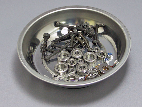 の組み立てに入りました。キットボックスは思ったより小さく、中を開けると番号がつけられたパーツパックや組み立て説明書、ボディ、シャーシなどが見えます。まず説明書をよく読んでパーツをなくさないよう組み立て作業に入ります。すべての工程で使われるボルトのパックとベアリングのパックは袋に入れたままだと探すのが大変なので、すべて